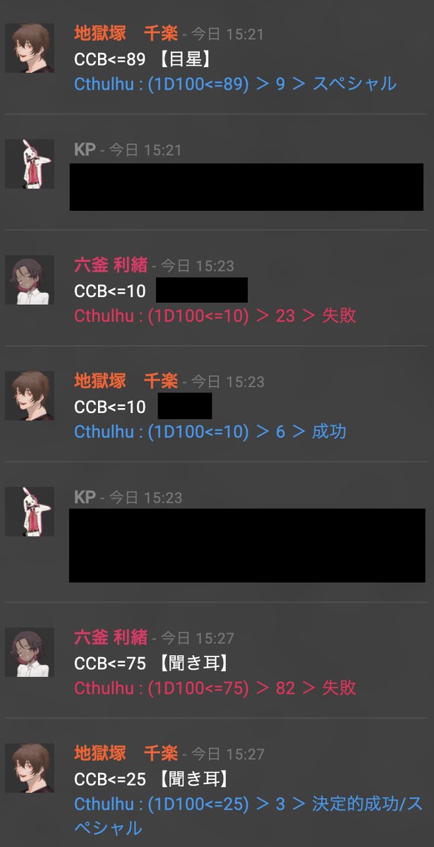 01~05=決定的成功(クリティカル) 06~50=成功 51~95=失敗 96~100=致命的失敗(ファンブル) これがダイスロールの結果によるものになります。 ただし注意してほしいのが "必ずしもこの数値が正しい訳ではない" という事。 ルールブックのp38にここまではココフォリアを使うための事前準備です。 次の記事はキャラクター設定について記事をまとめまーす。 参考・使用サイト CoC能力値ダイス振り 100), 無料ココフォリア用素材戦闘ラウンドカットイン1 (¥ 100), cocシナリオ集虚庭 (¥ 1,100KP:母国語10+サバイバルに成功してください 佐藤 一郎:cbr(95,75) 母国語 サバイバル(コンクリートジャングル) → 13スペシャル,スペシャル → 成功 KP:では魔導書「くびまでうり」のプレゼンに成功しました 佐藤 一郎:ありがとうございますww